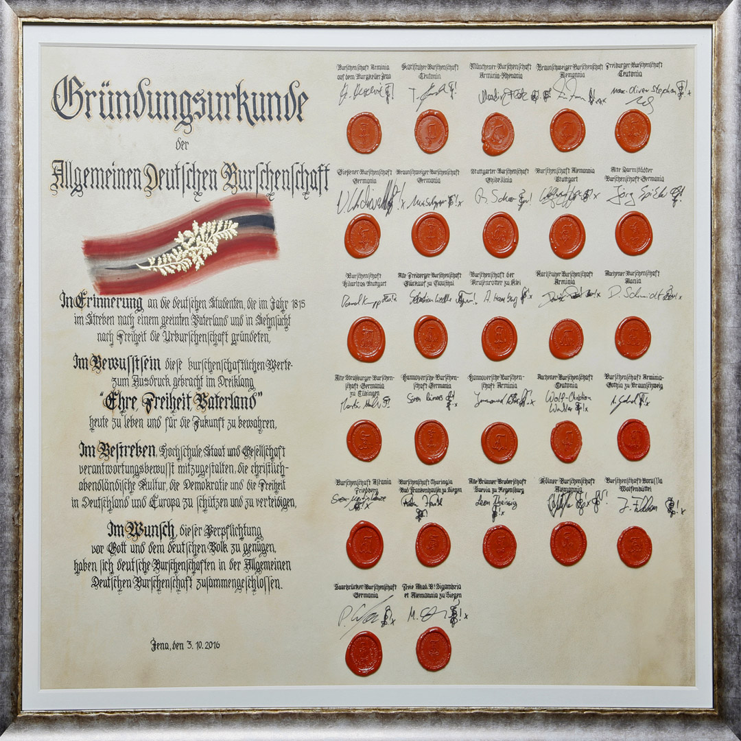 Mit der feierlichen Unterzeichnung der Gründungsurkunde der Allgemeinen Deutschen Burschenschaft durch die Vertreter der Bünde wurde die Gründung des Verbandes am 3. Oktober 2016, dem Tag der Deutschen Einheit, feierlich vollzogen.
