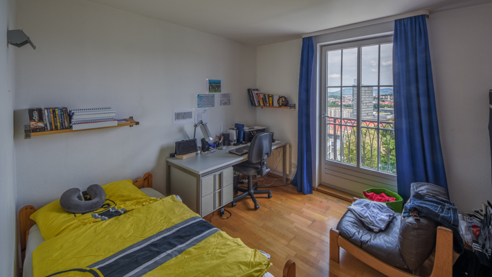 Wir vermieten die insgesamt 15 Zimmer in unserem Haus an Studenten und an unsere studierenden Mitglieder. Die durchschnittliche Zimmergröße in den bewohnten Stockwerken unseres Hauses beträgt zwischen 15m² bis 20m². Alle Räume werden natürlich vollmöbliert vermietet (Bett, Nachttisch, Schrank, Schreibtisch und Stuhl). Der Wohnbereich erstreckt sich über die drei oberen Stockwerke und verfügt über zwei Bäder, ein Wohnzimmer und eine großzügige Küche.